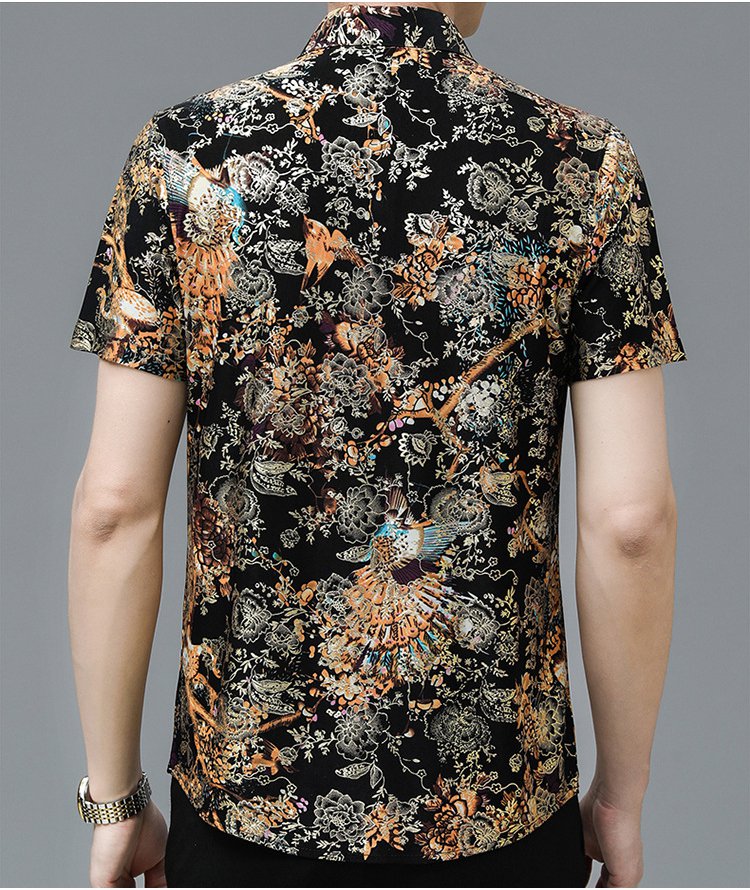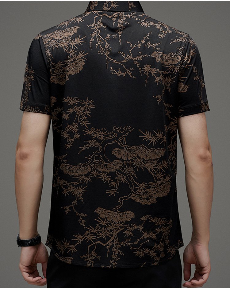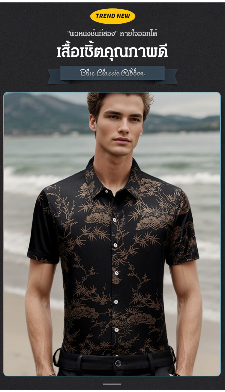 เสื้อเชิ้ตแขนสั้นผ้าไหมเย็นลายเท่ของผู้ชาย